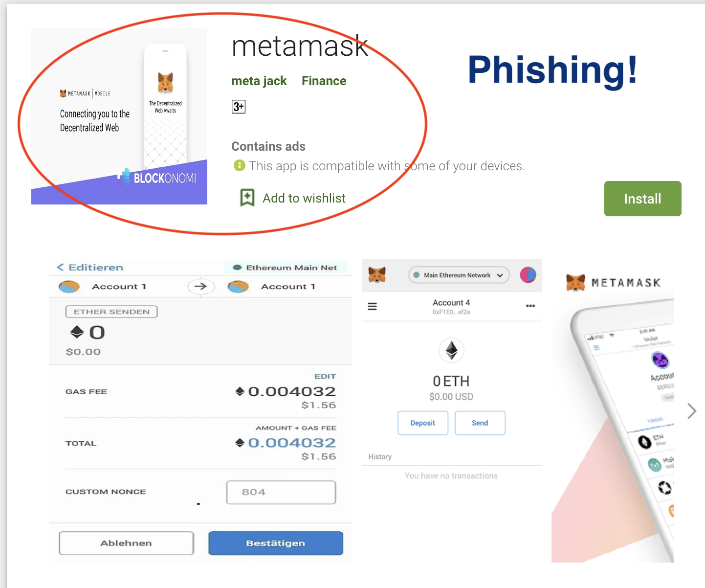 Importantly, reviews and the number of downloads are not useful in determining whether a wallet is a phishing attack. Attackers use fake accounts to boost the number of downloads and leave fake 5 star reviews on the phishing app, misleading victims into trusting the app. We’d recommend that users always download an app through a link from the official project website.